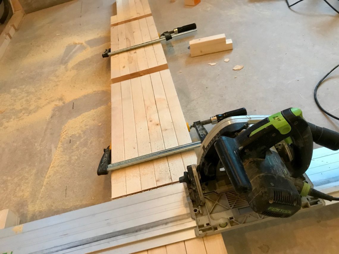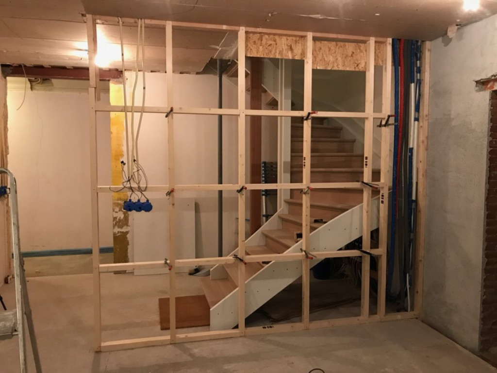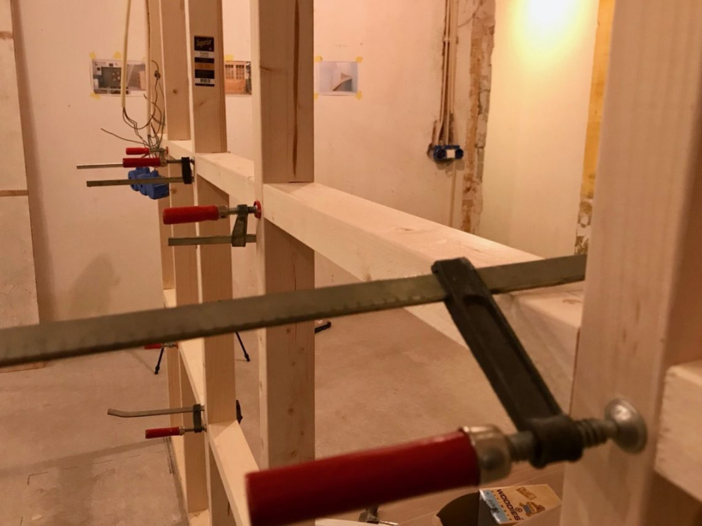 Boven het frame zat al een balk aan het plafond vastgeschroefd. Daar heb ik inkepinkjes uit gezaagd, waar het frame netjes in past. Ook aan de buitenmuur zat al een balk gemonteerd. Twee vaste zijden dus. In de vloer kunnen we niet boren, daar loopt de vloerverwarming onder. Om te voorkomen dat de muur later zou kunnen schuiven, heb ik de onderste horizontale balk met een dik pak constructielijm ingesmeerd. Alle staande balken heb ik bijna een millimeter te lang afgezaagd. Toen ik het frame rechtop zette, duwden de staanders op die manier zichzelf met enige kracht tussen de plafondbalk en de vloerbalk. De vloerbalk kon geen kant meer op Morgen is die lijm droog, en kan je als het goed is aan de muur trekken en duwen zoveel je wil, maar staat hij voor altijd aan de vloer verankerd.