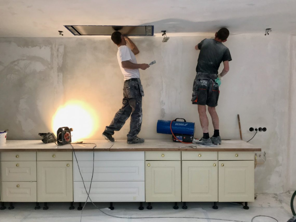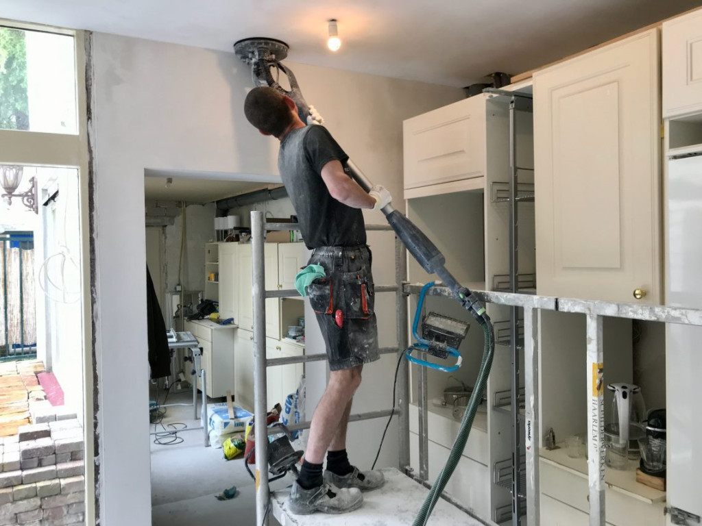 Ze schuren vandaag door tot de laatste minuut, want, hou je vast, morgen gaat het keukenplafond al gespoten worden. En wie weet, nemen ze ook de woonkamer in één moeite mee.