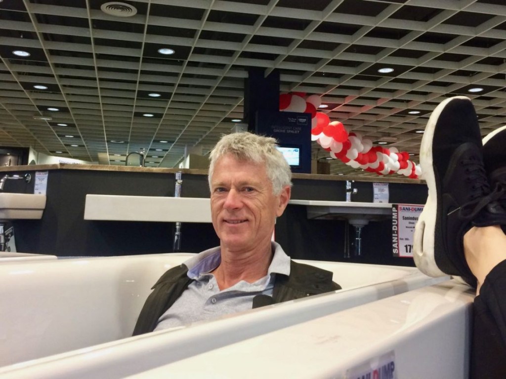 Nadat we uit bad kwamen bekeken we ook nog urinoirs en wastafels en vlakspoel wc’s. De ontzettend lieve man uit de badkamer winkel wilde wel een mooie prijs maken, zeker als we alles in één keer kochten. Het moet afschuwelijk zijn om in de Arena Woonmall te moeten werken. Ik kreeg na een half uur al hoofdpijn van het gebrek aan frisse lucht. Dus ik wilde het liefst alles bij die man kopen, als support. Echter, zodra het op geld aankomt loop ik even naar een volstrekt andere kant van de winkel, omdat Hessel dat in alle rust nog wat suggesties aan de verkoper kan doen, om eea nog goedkoper te maken. (…)