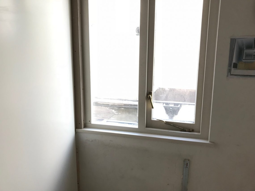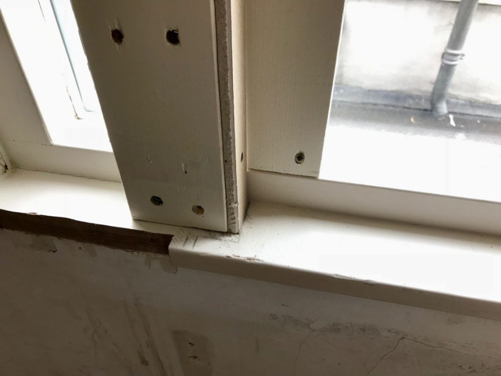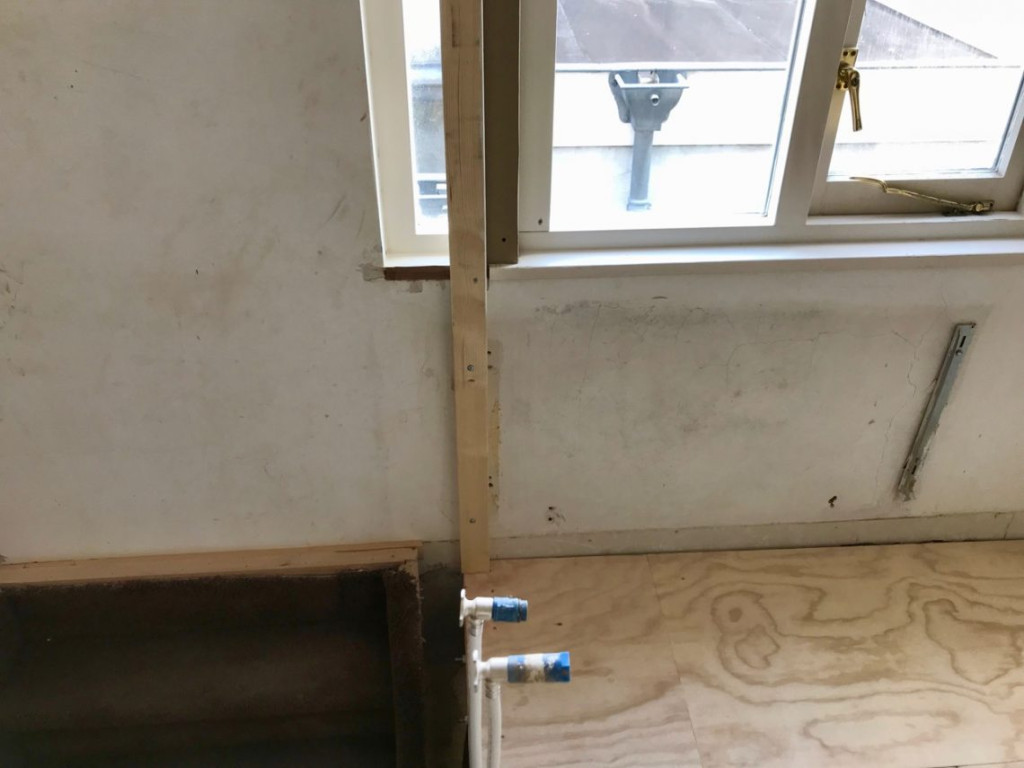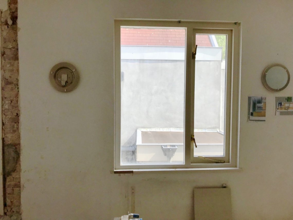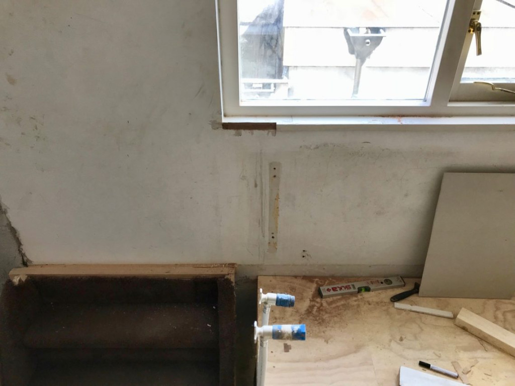 Daar moest dus iets aan het raam aangepast gaan worden. Ik begon met het wegzagen van een stukje vensterbank. Over die vensterbank, en over het uiterste linker gedeelte van het raam plak ik gewoon simpel een gipsplaat.