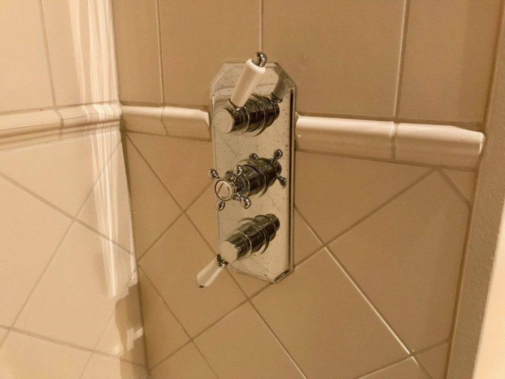 Dan de douche. Er was een enorme regendouche, waar ik pas halverwege achter kwam dat je ‘m op maximaal kon zetten. Zalig! Hessel heeft de knoppen gefotografeerd ipv de douchekop. Maakt niet uit.