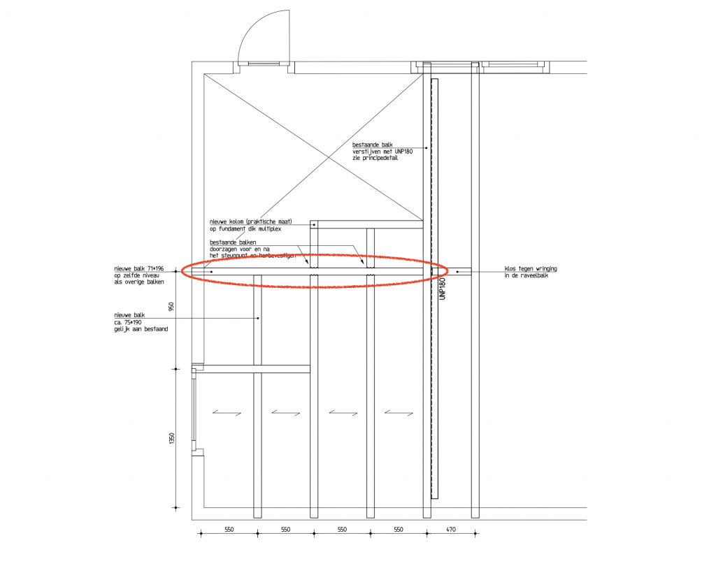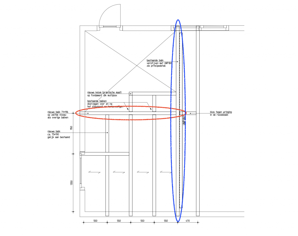 Alle bestaande lengtebalken hangen sindsdien als het ware aan de “rode” balk. Die “rode” balk op zijn beurt hangt weer aan een bestaande balk, die ik hieronder blauw heb omcirkeld. Een echte “T-constructie”