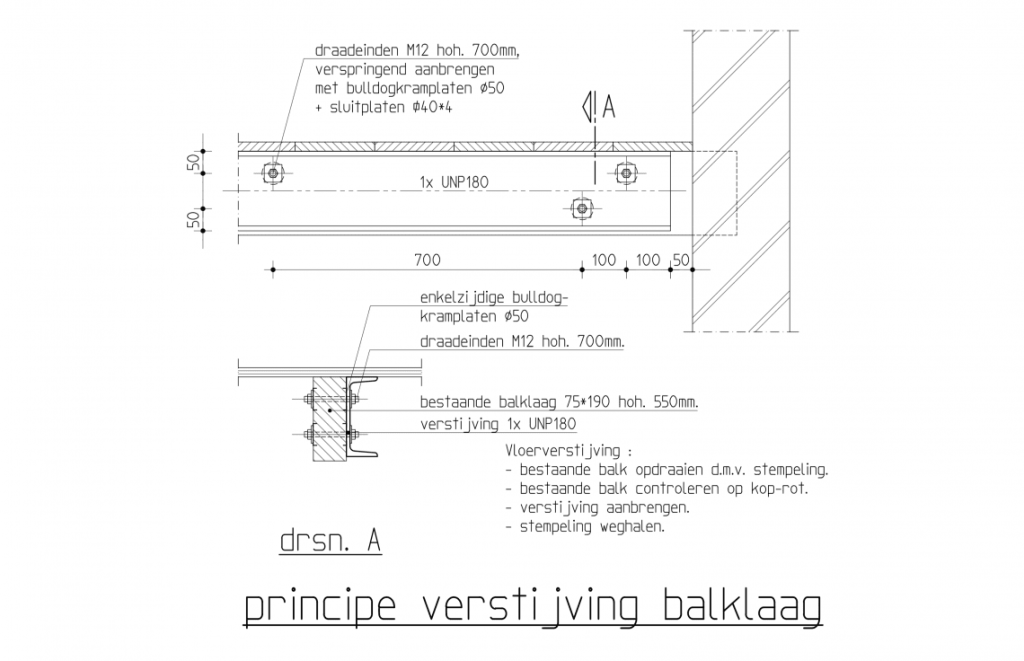 Die klos is een makkie. Men neme een stukje houten balk van juiste lengte, en bewerkt één kant precies zo, dat hij de exacte vorm van de binnenzijde van de stalen U-balk krijgt. Die kant van het balkje mep je klemvast in de stalen balk, de andere kant bevestig je met een normaal anker aan de tegenoverliggende houten balk. Nu is de theoretische kans dat de stalen balk alsnog door het gewicht van de rode balk zou “kiepen” een stukje verminderd.