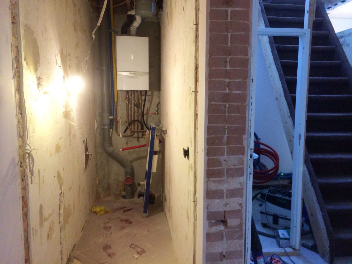 De WC in de gang is op dit moment het episch centrum van alle installatie werkzaamheden. De nieuwe CV ketel is tegen de achtermuur gemonteerd, en daarvandaan gaan alle water en verwarmingsleidingen het huis in. Bart is lekker bezig, boort overal gaten, en sluit van alles aan.