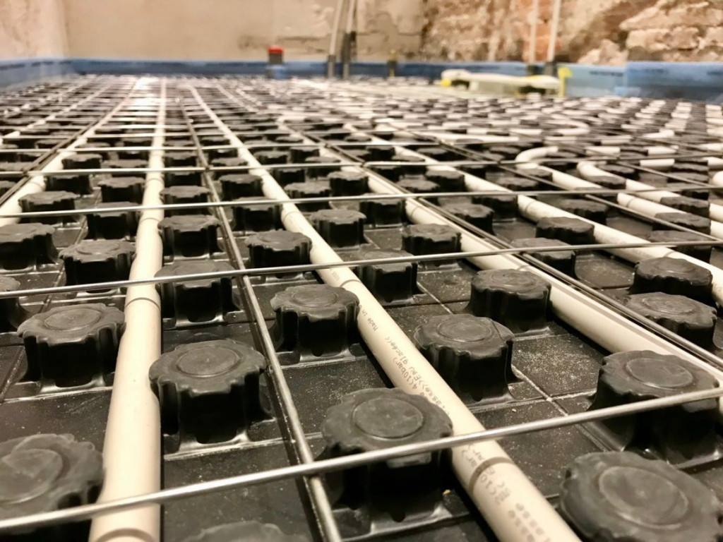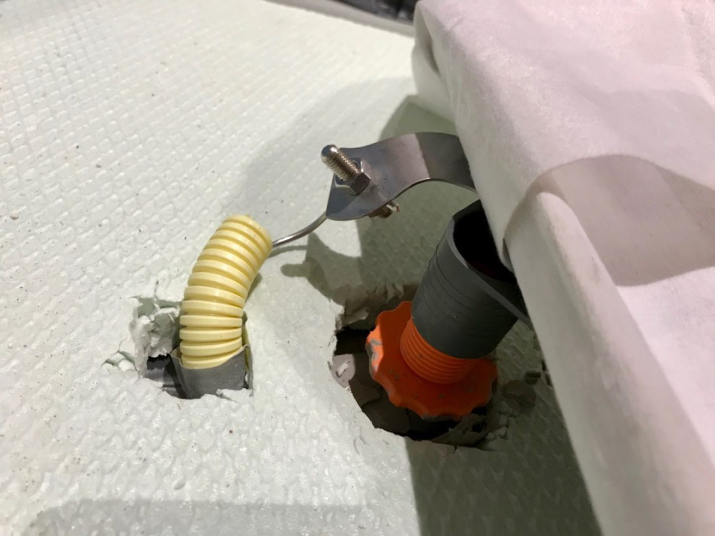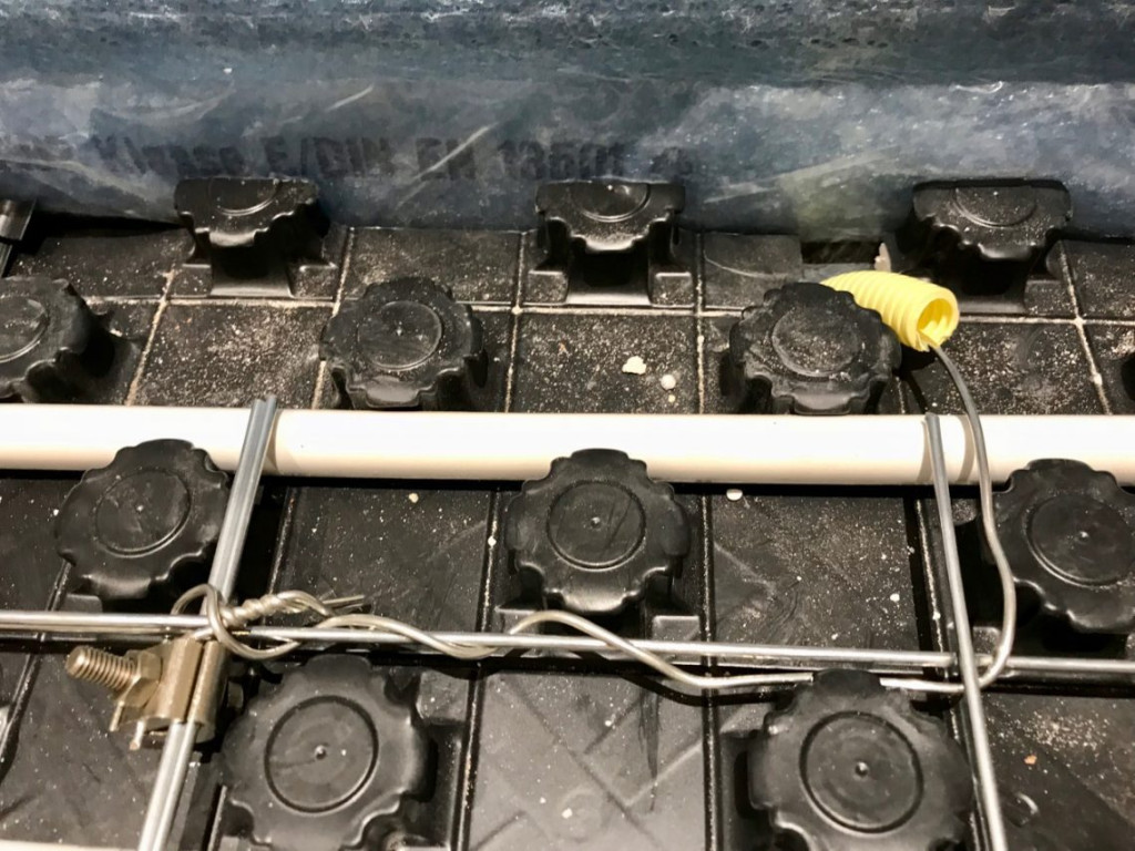 Aardematten gelegd en aangesloten, de douchegoot geaard, ander klein spul.