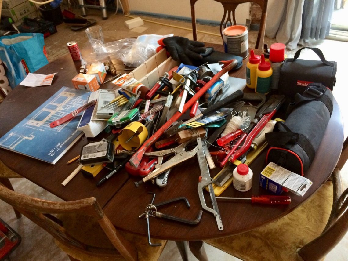 Daarna was het gereedschap aan de beurt, kregen de schoomaakmiddelen hun eigen kast, werd de bijkeuken omgedoopt in werkkamer, met een strak georganiseerde opstelling voor alle zware machines, electraspullen, kastjes voor de schroeven en spijkers en zo meer, en kreeg ik steeds meer het gevoel dat ik weer controle kreeg over onze eigen puinhoop. Nou morgen nog alle zooi de deur uit, en dan gaat de verbouwing weer vrolijk verder.