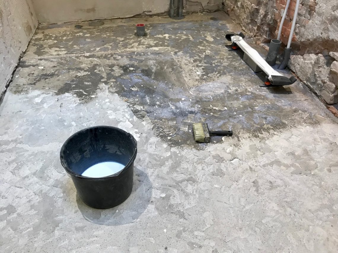 Vandaag was egalisatiedag. Eerst heb ik de doucheafvoer helemaal horizontaal op de juiste hoogte op de vloer bevestigd. Daarna is de hele vloer minutieus gezogen. Vervolgens heb ik met een kwast een hechtprimer aangebracht. Ik had geprobeerd uit te rekenen hoeveel zakken egalisatiemortel ik nodig zou hebben. Volgens mij had ik aan vijf zakken genoeg. Ik heb de eerste zak met water gemixt, en goot de emmer over het achterste gedeelte van de vloer uit. Met een spaan verdeelde ik de mortel. Dat smeerde lekker uit zeg! Met één kuip bleek ik tot de helft van de vloer te komen.
