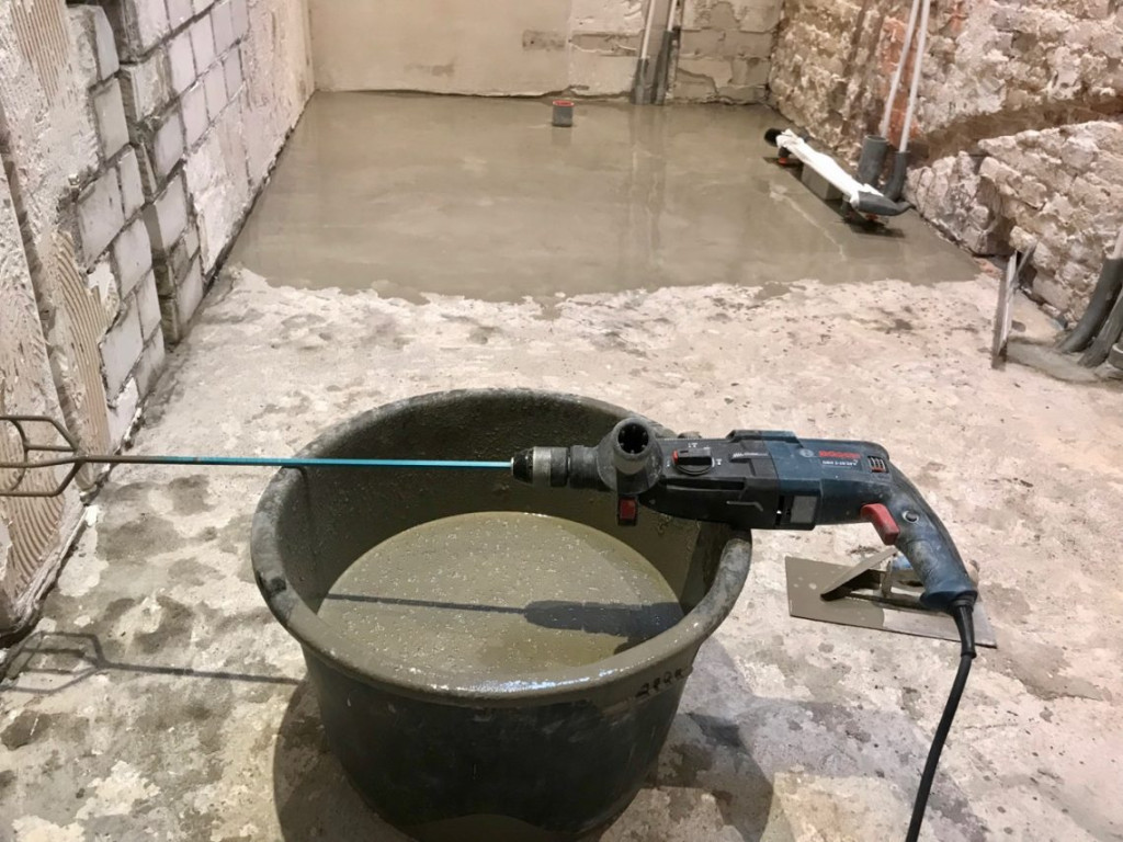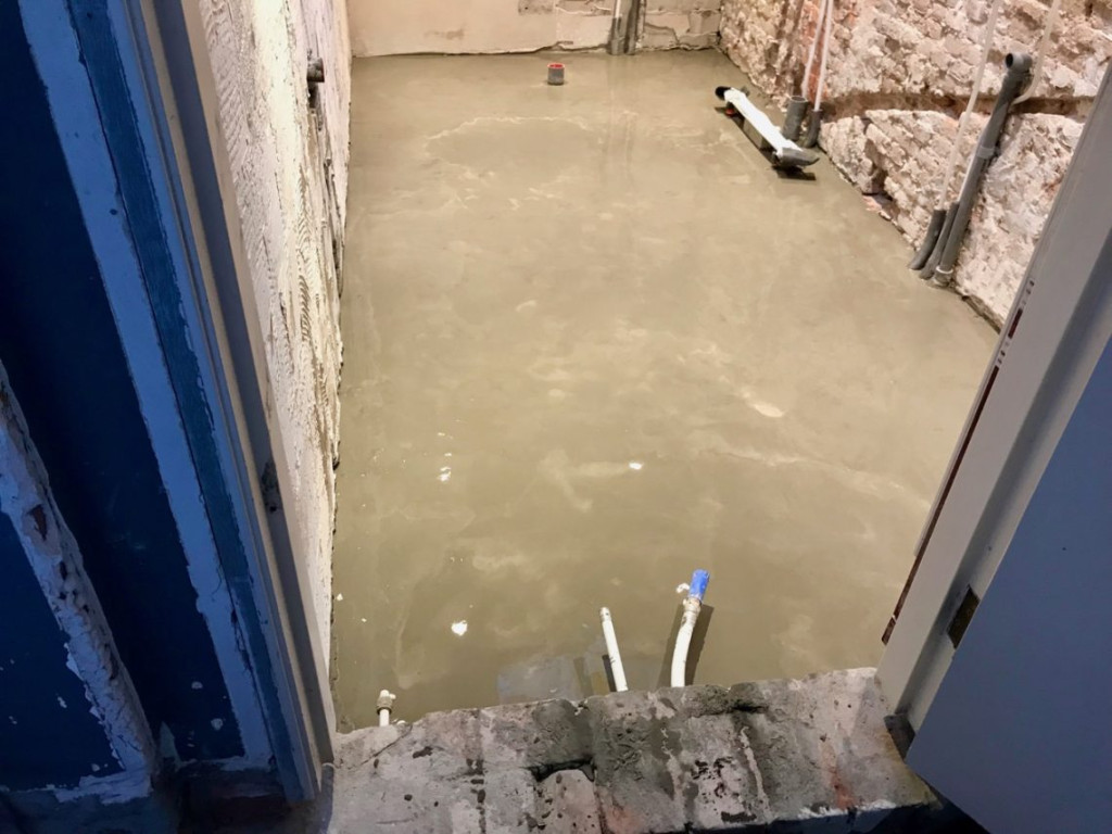 Vandaag was egalisatiedag. Eerst heb ik de doucheafvoer helemaal horizontaal op de juiste hoogte op de vloer bevestigd. Daarna is de hele vloer minutieus gezogen. Vervolgens heb ik met een kwast een hechtprimer aangebracht. Ik had geprobeerd uit te rekenen hoeveel zakken egalisatiemortel ik nodig zou hebben. Volgens mij had ik aan vijf zakken genoeg. Ik heb de eerste zak met water gemixt, en goot de emmer over het achterste gedeelte van de vloer uit. Met een spaan verdeelde ik de mortel. Dat smeerde lekker uit zeg! Met één kuip bleek ik tot de helft van de vloer te komen.