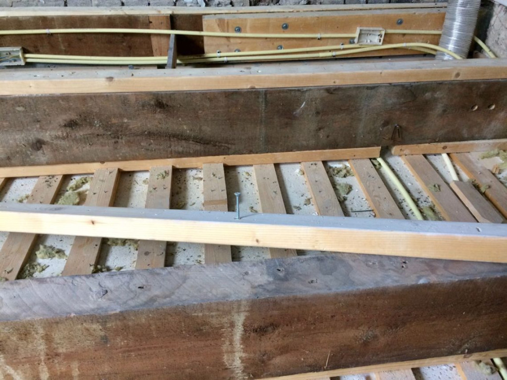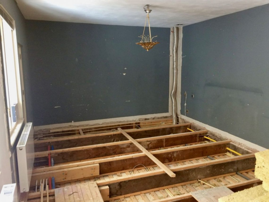 Voor de lunch had ik de laatste koperen en PVC leidingen uit de vloer verwijderd, en in de middag was ik al bezig met het verstevigen van de oude balklaag.