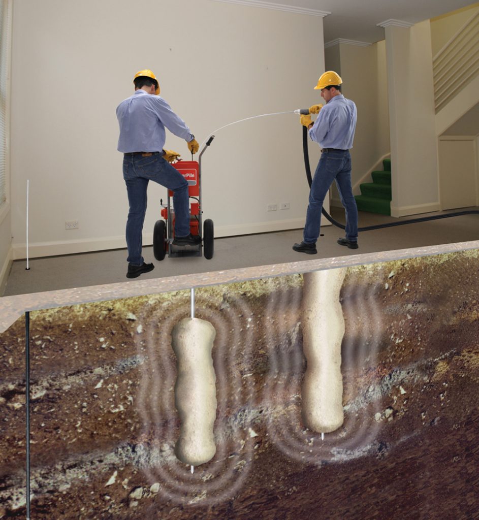 Toen die dunne buis ook zes meter diep zat, werd met enig geweld de eerste dikke buis weer segment per segment uit de grond getrokken. De dunne buis bleef in de grond achter en werd, net als gisteren, met de geheime substantie vol geperst. Het spul kwam in het worstevel wat zich door de druk opende, en voilà, de heren hadden een kunststof paal onder het huis gefabriceerd.