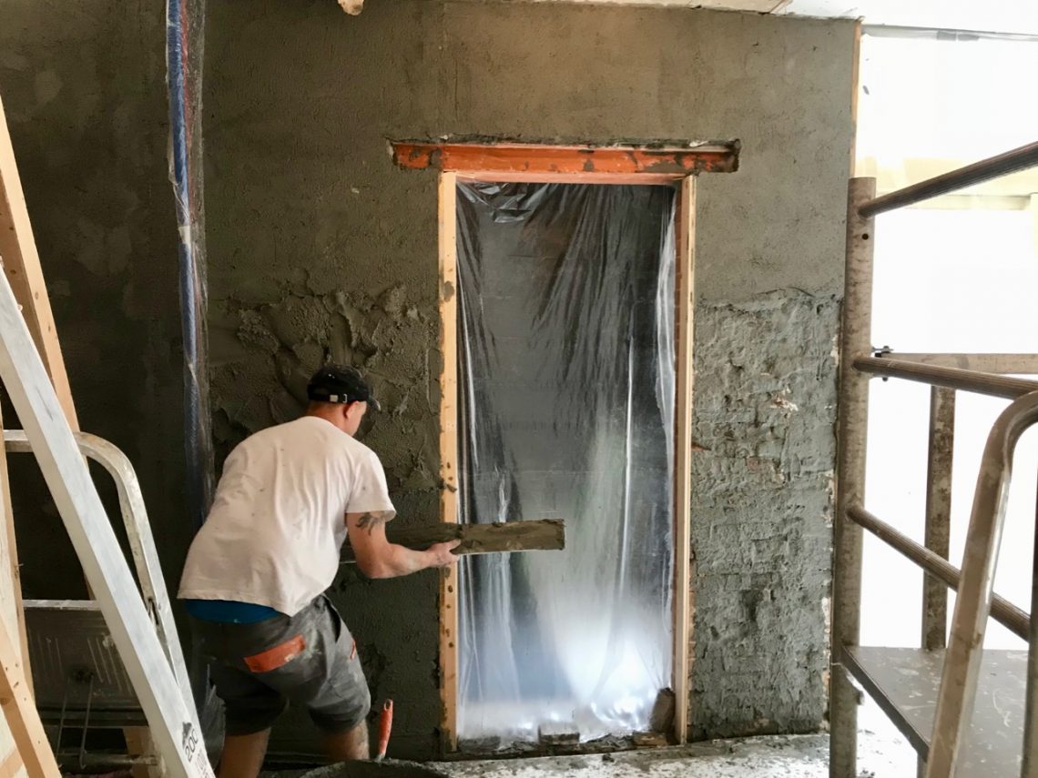 Toen ik vanochtend om 10 uur ons huis binnenstapte, was Marcin al een paar uurtjes bezig geweest. Mijn hele zelfgemetselde wasmachinekamermuurtje was al aangebrand, de bovenste helft van de muur was zelfs al beraapt en ik was net op tijd om hem de twee onderste stukjes te zien volgooien.