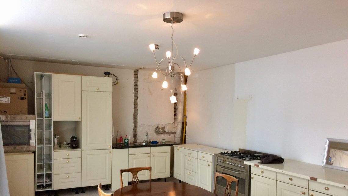 Vandaag ben ik verder gegaan met de elektrapuzzel. Inmiddels zijn alle extra keukengroepen aangesloten, en hangt er een lamp midden boven onze toekomstige tafel te schijnen. Om met een echte verbouwingsfoto af te sluiten, kan je hier van boven zien hoe de plafondcontactdoos er uit ziet.