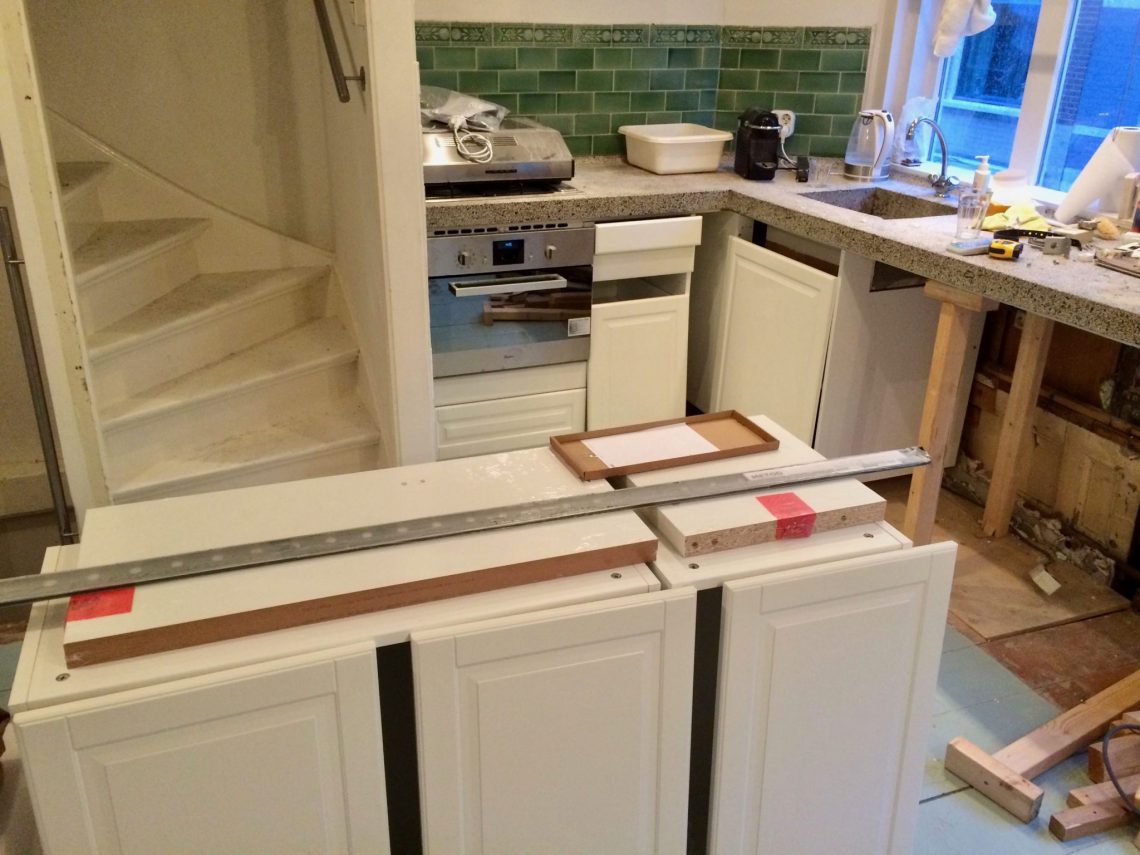 Tijd voor lekker stom en geestdodend werk. Het monteren van de resterende Ikea keukenkastjes. Tegen het eind van de dag stond het hele keukentje netjes in gelid, klaar om dit weekeind de laatste afwerking te gaan krijgen.