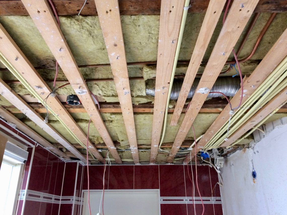 Het viel al met al best nog wel mee met de demontage van het plafond. In de rest van het huis is overal keurig dubbel gipsplaat aan de plafonds bevestigd. Daar is de brandweer erg blij mee, het betekent een brandwerendheid van 60 minuten, ruim binnen elke norm. In de bijkeuken is er slechts een enkele laag gipsplaat gebruikt. Dat mocht denk ik indertijd, omdat er recht boven het plafond een betonnen vloer geplaatst is, en een knappe brand die zo’n vloer in de fik krijgt. De kans dat het vuur naar de volgende verdieping doorslaat is door dat beton niet zo groot. Een enkele laag gipsplafond laat zich een stuk makkelijker verwijderen dan een dubbele laag. Even de koevoet tussen gips en rachels (de houten plankjes die onder de balken geschroefd zitten), een beetje wrikken, zodra er ruimte komt met je hele gewicht aan het plafond gaan hangen, en het gips breekt in handige stukken af.