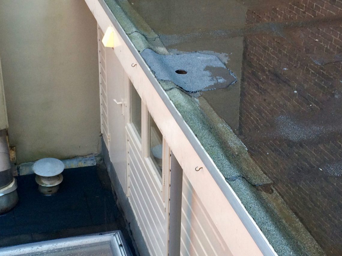 Waar ik een beetje zorg over had was het dak van het badkamertje boven. Dit dakje stond namelijk permanent vol water. Nu heb ik in Amsterdam een keer lekkage gehad. Toen ik ’s avonds thuis kwam bleek mijn hele kledingkast/kamer en slaapkamer nat te zijn omdat water dat op het dak stond uiteindelijk bij een verkeerde windvlaag de weg naar bedenen had gevonden. De situatie op het dak in Amsterdam is uiteindelijk verholpen, maar de schrik zit er bij mij nog altijd in, zeker als het regent.