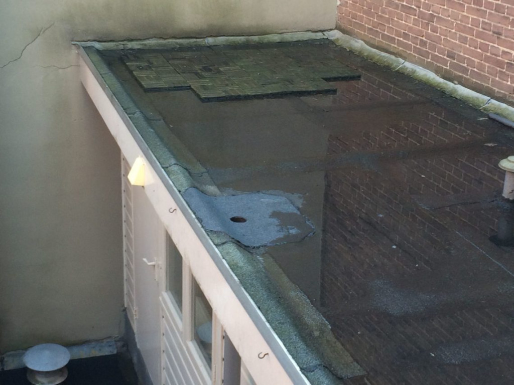 Waar ik een beetje zorg over had was het dak van het badkamertje boven. Dit dakje stond namelijk permanent vol water. Nu heb ik in Amsterdam een keer lekkage gehad. Toen ik ’s avonds thuis kwam bleek mijn hele kledingkast/kamer en slaapkamer nat te zijn omdat water dat op het dak stond uiteindelijk bij een verkeerde windvlaag de weg naar bedenen had gevonden. De situatie op het dak in Amsterdam is uiteindelijk verholpen, maar de schrik zit er bij mij nog altijd in, zeker als het regent.
