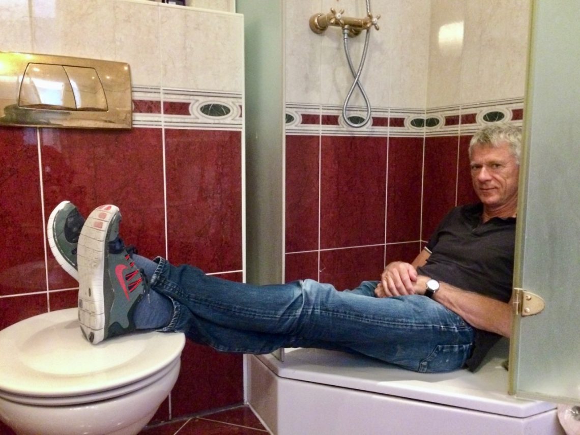 Dus vrijdag deden we voordat we puin gingen ruimen “de badkamer test”. Hessel had alle attributen op de juiste plaats gezet. En we konden zo schuiven en uitproberen hoe het in het echt was. Bijvoorbeeld het urinoir. Dat is perfect.
