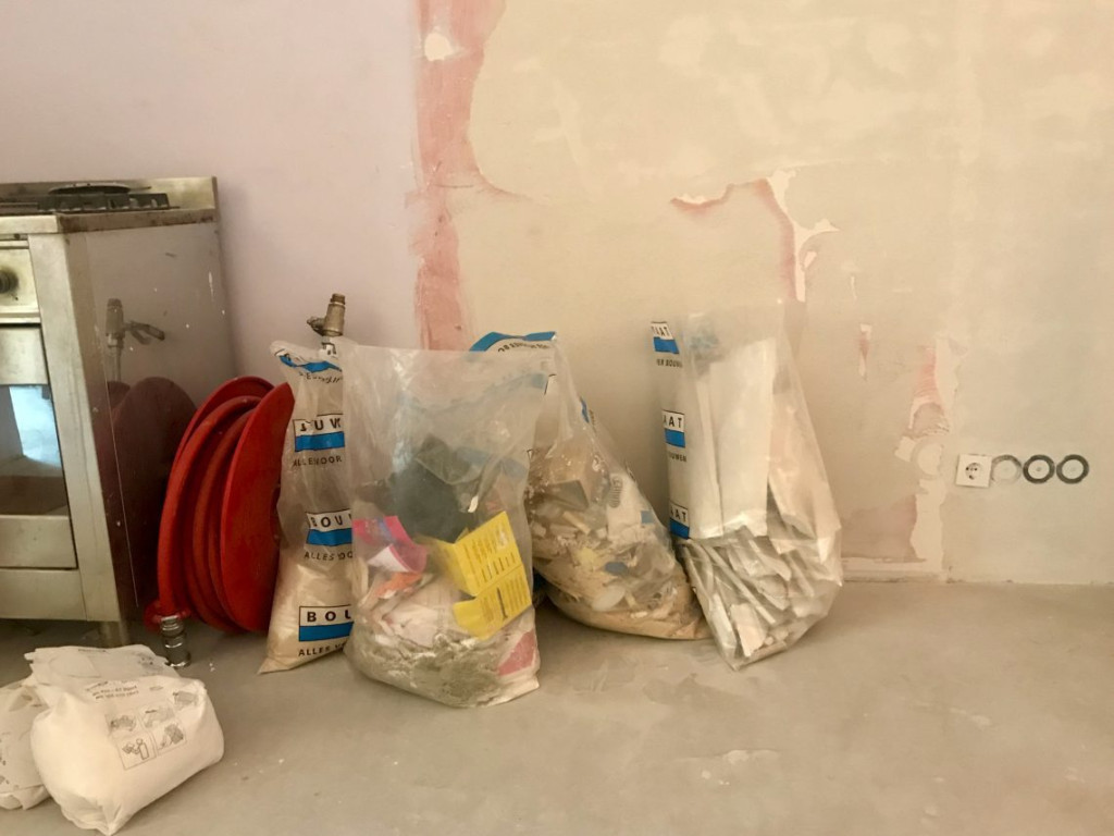 Het rockwool ging in vakjes in de muur van de keuken (waar later de grote kast komt) en ook in alle hoeken en gaten van mijn lichaam (…).