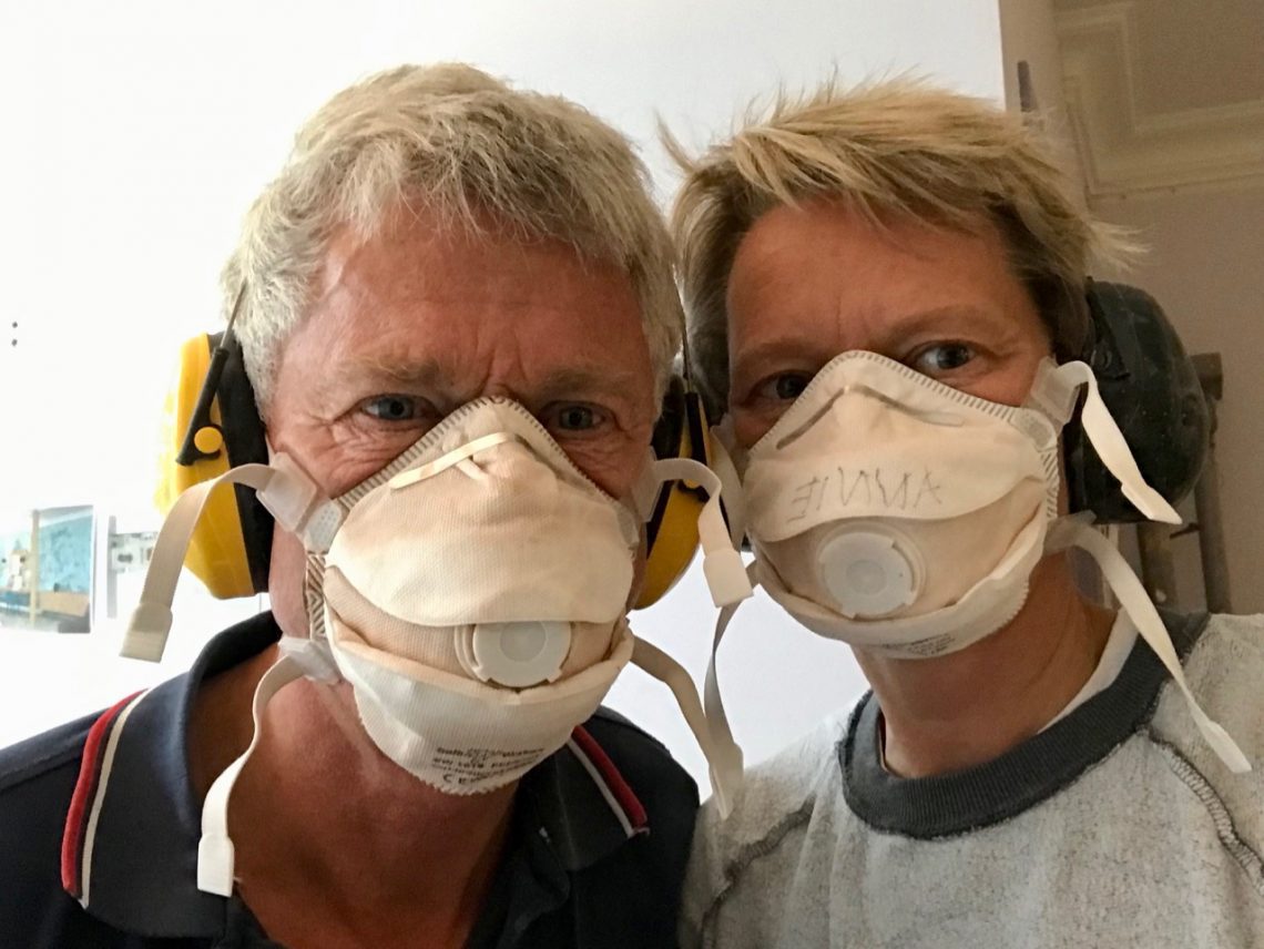 Op een gegeven moment hadden we besloten waar en hoeveel stopcontacten er moesten komen. Hessel startte met de eerste sleuf. Het is een afschuwelijk werk vind ik, want het maakt een t-herrie en is vrij zwaar. Plus dat het stof om je oren vliegt, in je contactlenzen, in je huid, overal. Plus dat we het heel vervelend vinden voor de klanten van de buren. Heb je net een kaartje gekocht om je fantasietjes werkelijkheid te laten worden, boort de buurman er de hele dag doorheen…Niets belette Hessel echter om zijn beste beentjes voor te zetten: