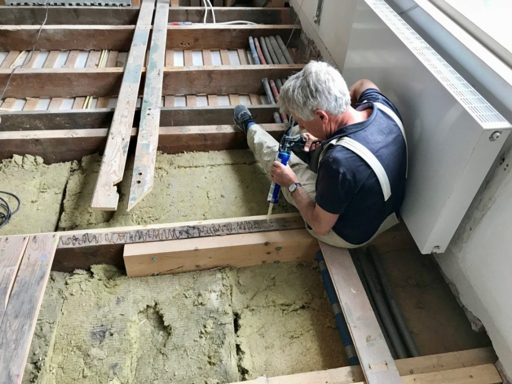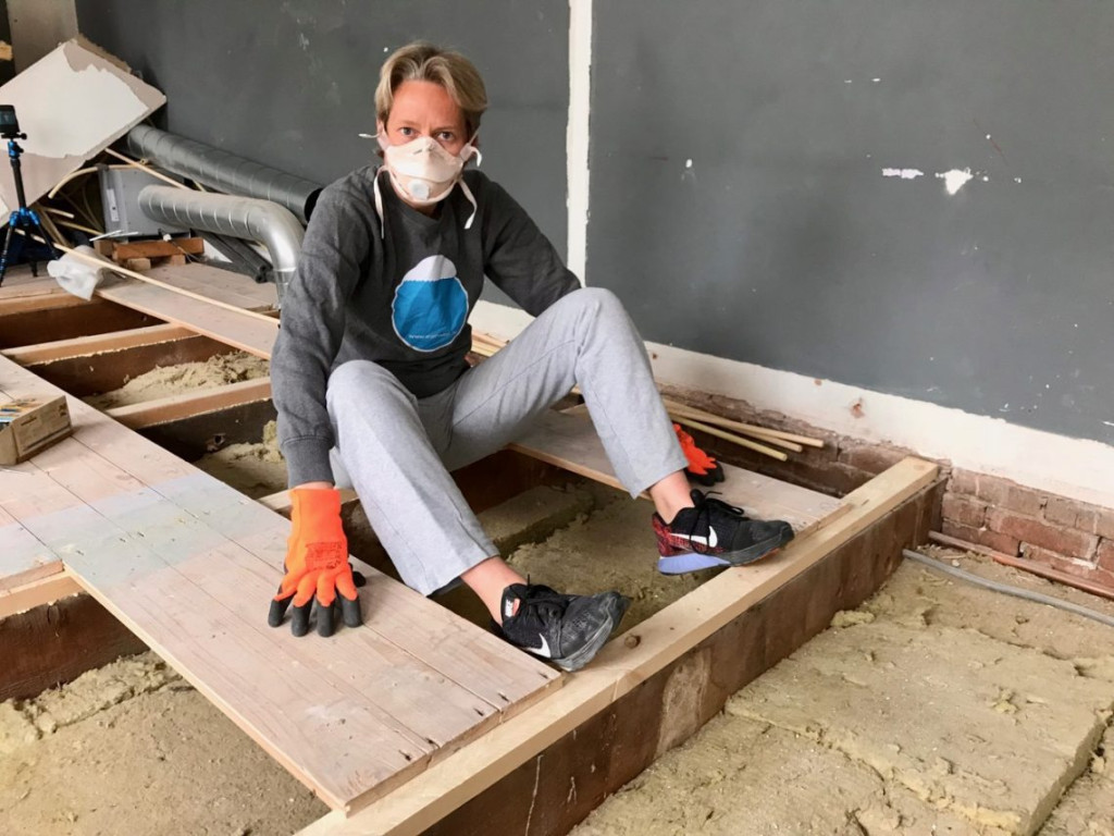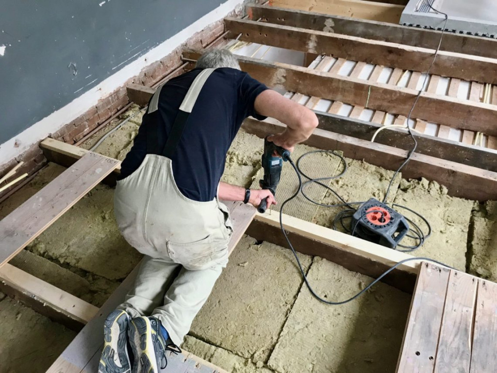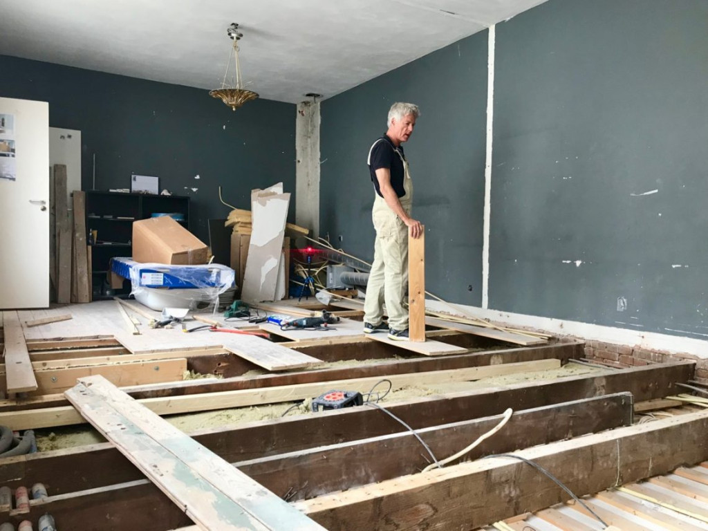 En dan in dit geval heel snel samen het nieuwe stuk hout onder de stukjes vloer te frummelen. Dit deden we door allebei op een balk te gaan zitten en op de juiste tel de boel aan te trekken. Onderstaand een foto van mij, waarbij dit net is gelukt. Op het rockwool kan je niet echt staan, dus we zweefden een beetje tussen de vloer in feitelijk.