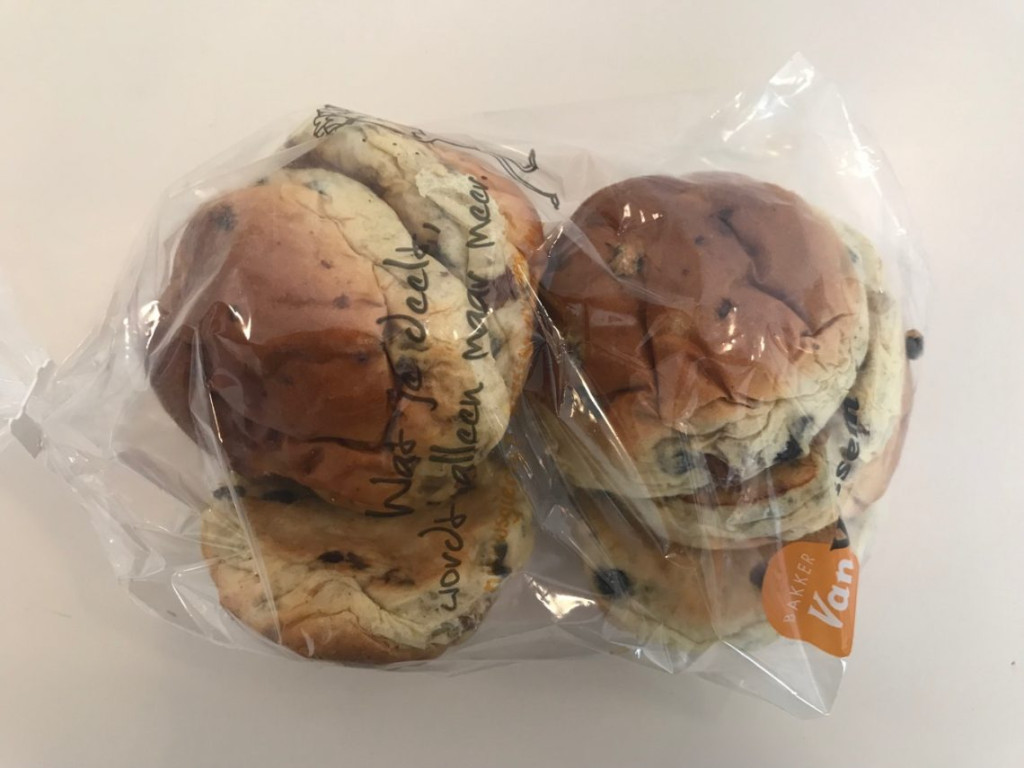 Hessel zette de zaagtafel klaar terwijl ik even krentenbollen haalde voor Sam en onszelf en misschien al voor het nieuwe zusje. Op de zak staat ‘wat je deelt wordt alleen maar meer’ wat me een mooie tekst voor de maandag lijkt.