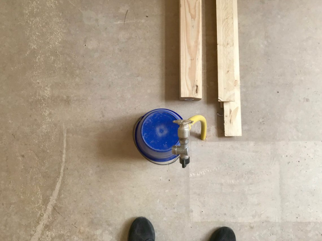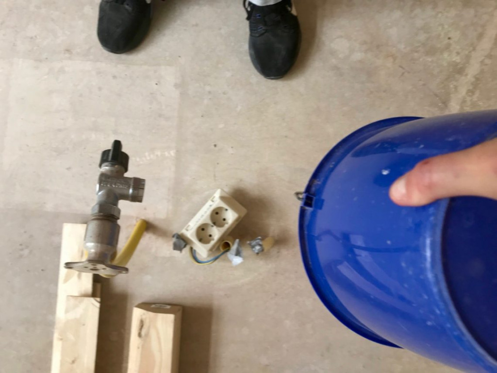 Het blauwe emmertje bewaakt de aansluitingen van gas en electra, van ooit, toen we een eiland zouden maken. Als die aansluitingen beschadigd raken, moet de hele vloer er weer uit. De foto is onscherp, maar dan kan je het toch even zien. Tot nu toe gaat het goed, maar het lijkt me echt iets voor mij om een week voor de verhuizing die aansluitingen er per ongeluk uit te knallen.