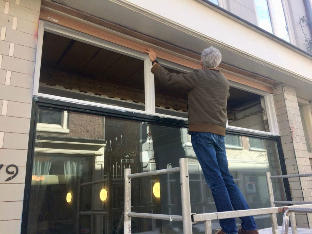 Samen bevestigden we de lat en ik lapte vervolgens voor de gezelligheid het raam. Er komen zo vaak mensen naar binnen kijken, nu kunnen ze het wat scherper zien allemaal. Hessel werkte het verder af en ik ging in de zithoek thee drinken. Tringtring fietsbel, daar kwam Jan Verburg aan, hij gaf gehoor aan onze oproep om vooral langs te komen. Allerlei ditjes en datjes passeerden de revue daar op de bank, en we hebben er alleen wonderlijke foto’s van; waar of Jan of ik heel raar kijken. Uit respect voor Jan kies ik nu de foto waar hij er tenminste goed op staat.