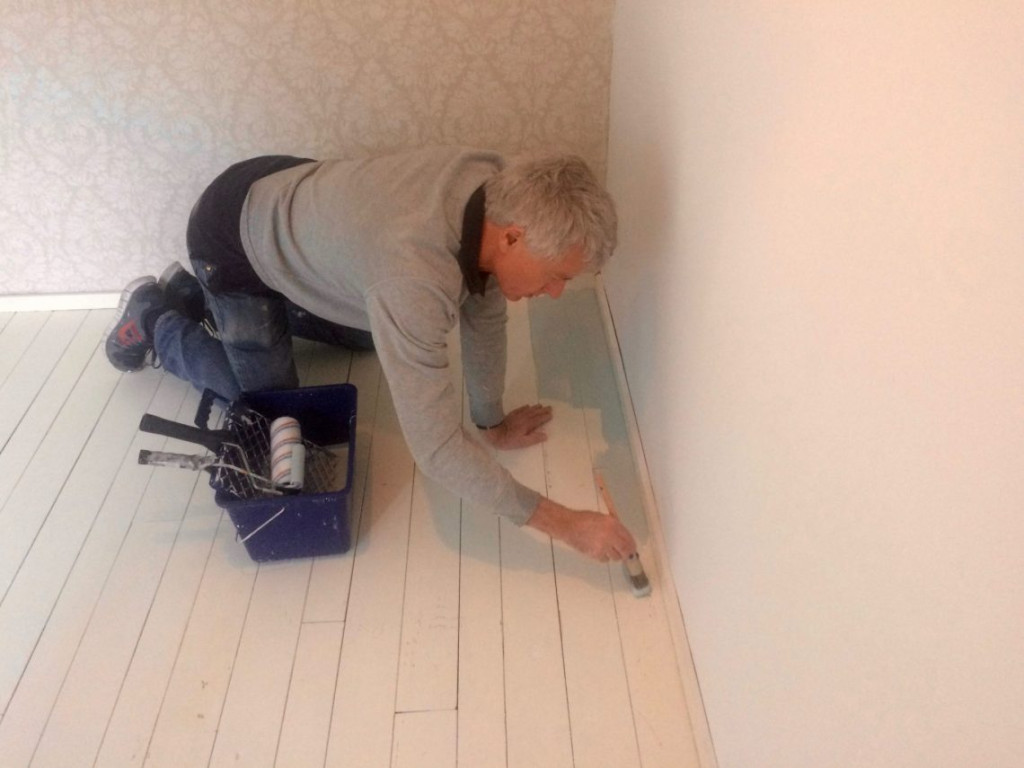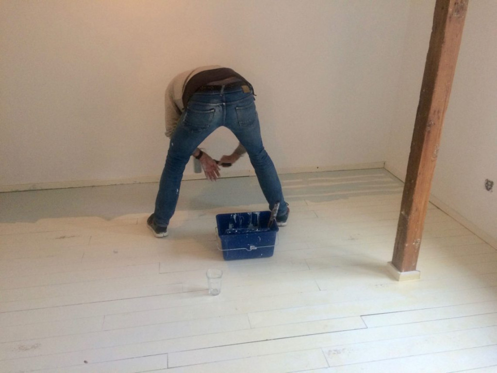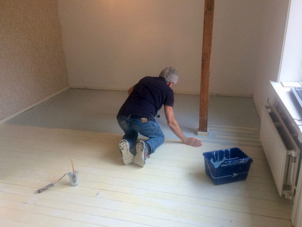 Eindelijk was het zover: Hessel ging de eerste kamervloer verven. Ik vind het zelf een geweldige kleur: groen/grijs. Het past bij het huis en is aanwezig, doch neutraal genoeg dat huurders zich er niet aan zullen storen. Het was nog best een klusje om het netjes en zo dekkend mogelijk te doen.
