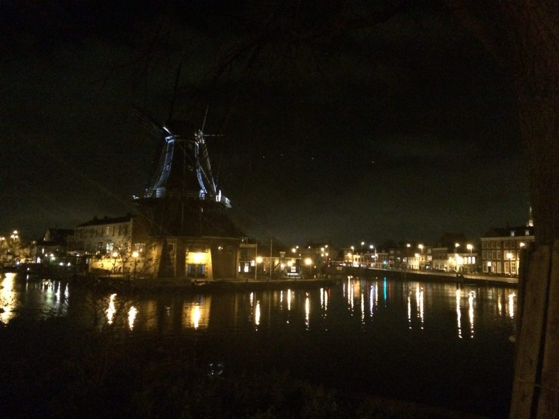 Dus hup de pont op, fiets in stalling bij CS, trein stond al te wachten en voor ik goed en wel in mn iPhone de nieuwtjes kon lezen, waren we al in Haarlem. Daar heb ik nog geen fiets, dus ik liep vanaf het station de Janszstraat door, naar de Nieuwe Gracht, linksaf richting het Spaarne. En opeens voelde ik wat ik ook op de gracht in Amsterdam wel eens voel. Het was doodstil op straat (?), donker, beetje vrieskou en de lichtjes van Haarlem weerspiegelden in het water. Heel mooi. Toen ik de brug van het Spaarne overstak (ik was er nog nooit geweest) kwam ik in een soort gebiedje wat net Broek in Waterland lijkt. Een paar hele mooie houten huisjes/panden. Net een mini dorpje. Ik moest er ook om lachen dat het pand dat ik het mooiste vond in gebruik is genomen door de ‘fietsenservice van de ANWB’. Dat hebben ze mooi bekeken.