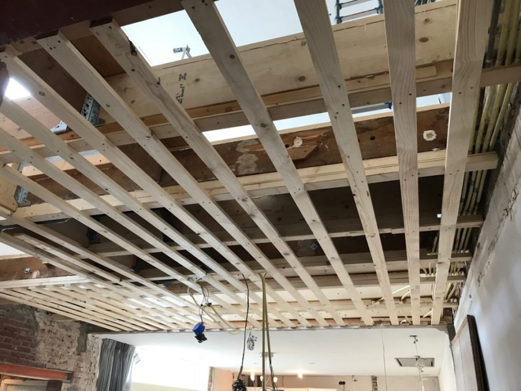 Daarna naar huis. Ik was al een tijdje niet geweest en het was heerlijk er weer te zijn. Het huis was best warm, niet zozeer in de woonkamer, maar wel in de keuken. Wij gingen de dwarslatjes aan het plafond bevestigen, waar later de gipsplaten op geschroefd worden. Eerst moesten de latjes volgens een uitgerekend schema van Hessel met een schroefje bevestigd worden. Ik hield ze vast en Hessel schoof ze aan de kant van het bestaande plafond tussen de bestaande latten.