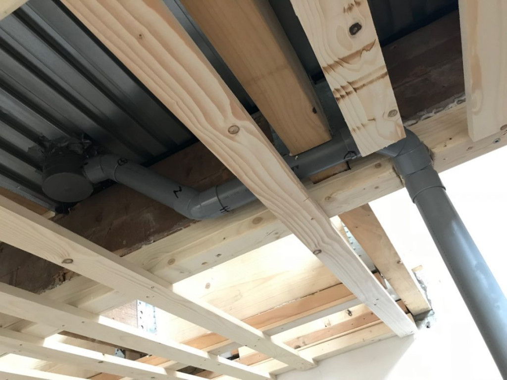 Toen ging Hessel de afvoer van de douche in de logeerkamer maken. Die moet er namelijk inzitten voordat het plafond dichtgemaakt wordt.