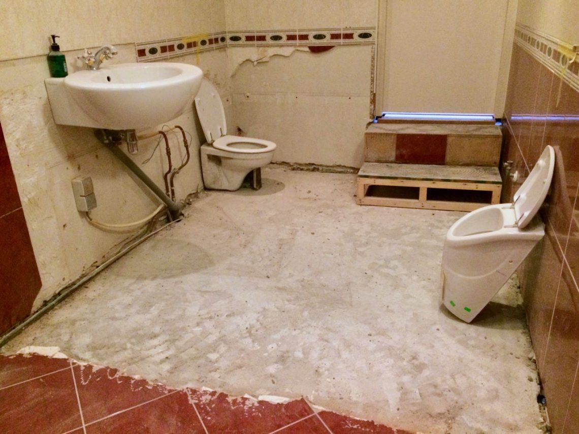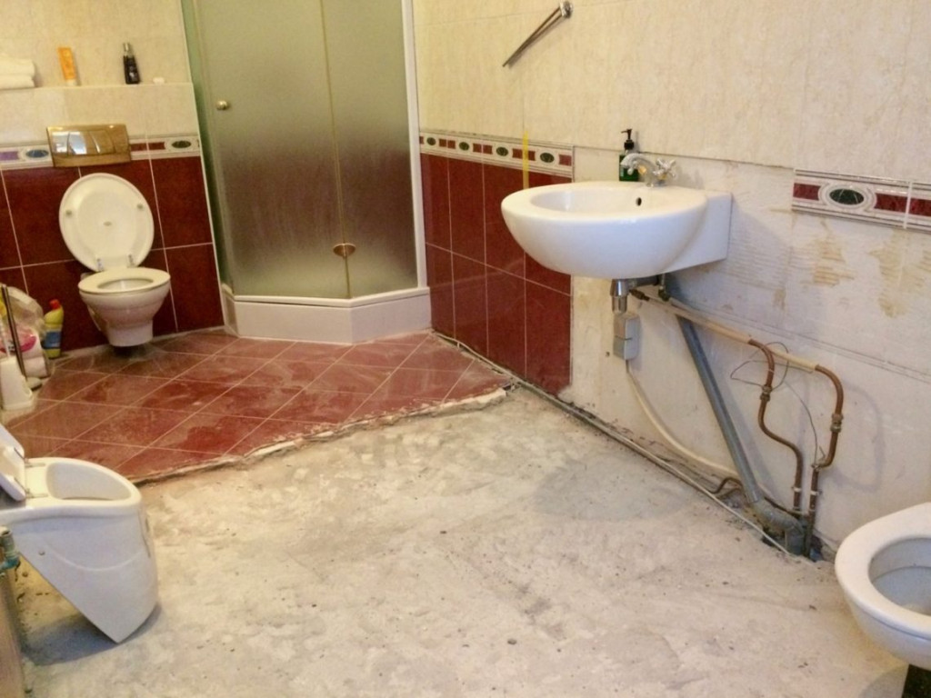 De vloer van de badkamer bestaat uit meerde lagen. Onderop is een betonlaag, daarop zand-cement, daarop ligt een witte tegel, en op de top de beroemde Kleine-Houtstraat-voor-al-uw-ontspanning rode tegel.