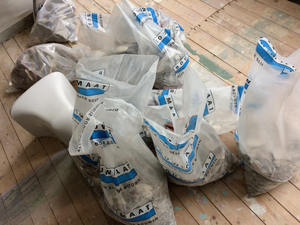 De hele spekkoek van oud spul is maar ongeveer 6 centimeter dik. Wat zou dat nou helemaal kunnen wegen, vraag je je voordat je aan de klus begint optimistisch af. Nou, dat antwoord heb ik inmiddels. Ik heb vandaag 10 zakken puin van elk ongeveer 30 kilo weten te produceren. Bijna 300 kilo steen heb ik weggebikt en opgeruimd. Lekker bezig!!