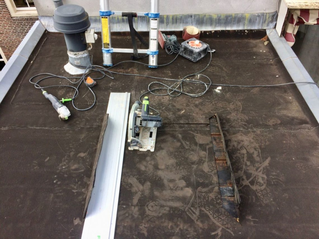 Daarna ging de cirkelzaag in de houten planken, en 20 minuten later hadden we een gat in in het dak.
