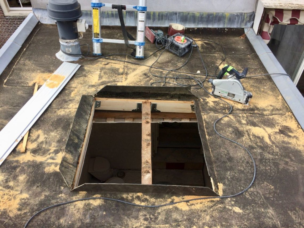 Ik had (volgens het inmiddels bekende systeem) van onder 4 gaten in het dak geboord, waar de vier hoekpunten van het dakluik moeten komen. Op het dak heb ik die vier punten verbonden en de dakbedekking losgesneden.