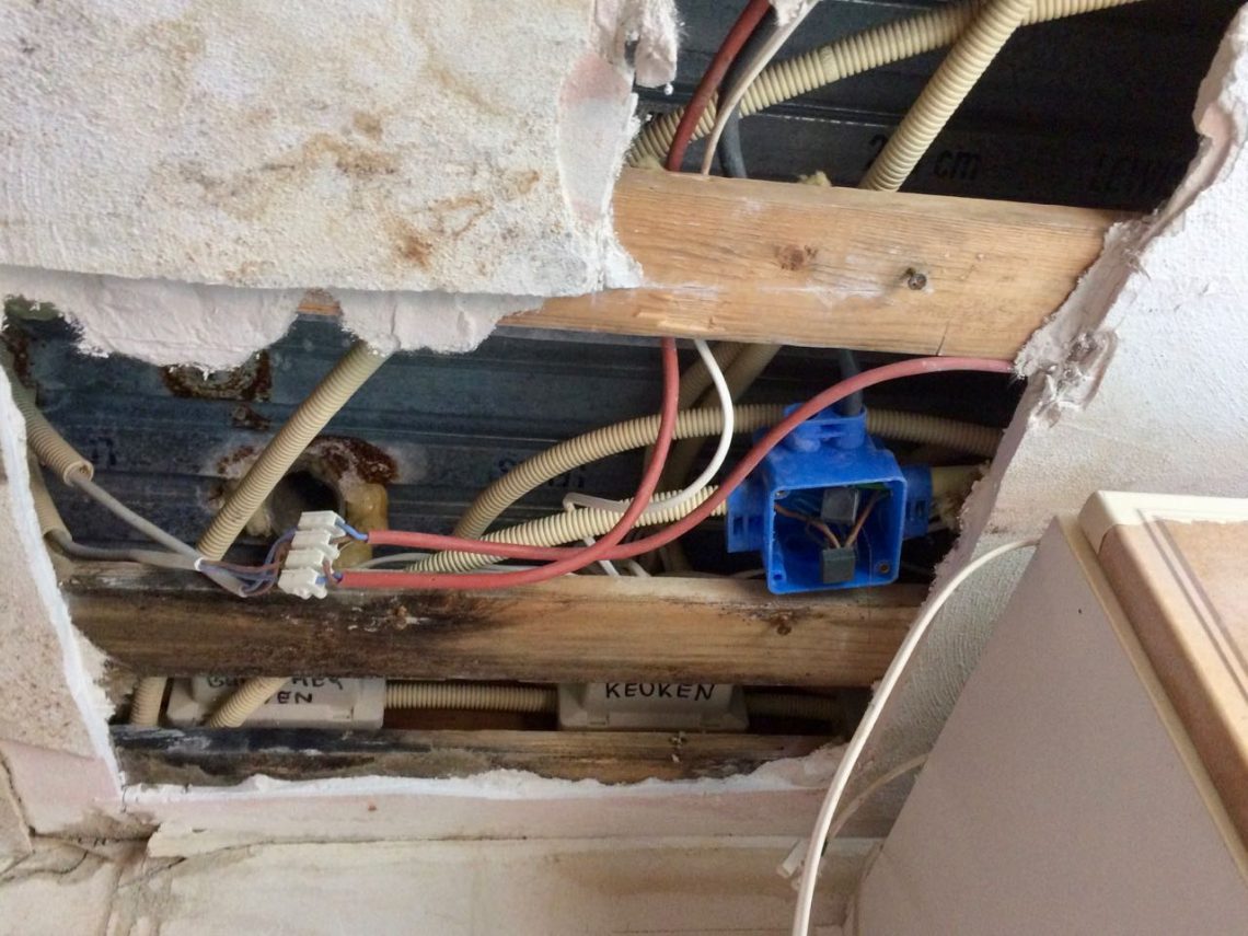 Dat was vandaag dus het eerste wat ik deed: keukenkastje verwijderen. Daarna het plafond er uit zagen, en ja hoor, een gigantisch knooppunt van leidingen.