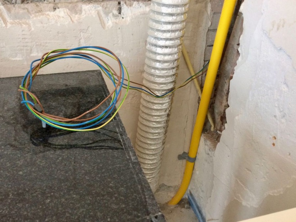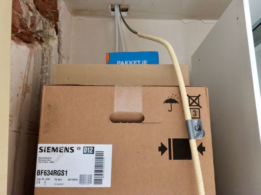 Dat was vandaag dus het eerste wat ik deed: keukenkastje verwijderen. Daarna het plafond er uit zagen, en ja hoor, een gigantisch knooppunt van leidingen.