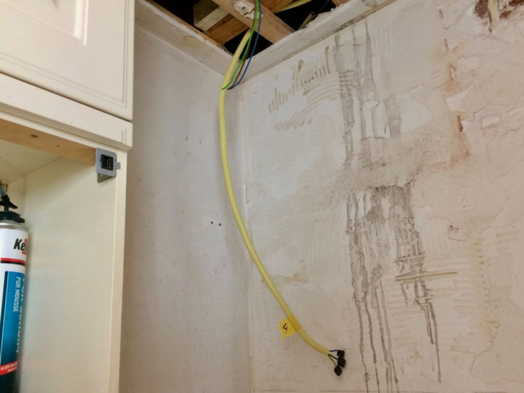 Ik wist dat er via onze slaapkamervloer twee leidingen door de muur van de bijkeuken liepen, beter bekend als stoppenkast groepen 3 en 4, en dat ze naar een onbekende plek vlak bij de achterdeur verdwenen. Het meest waarschijnlijke was een eindpunt in het plafond, recht boven het achterste bovenkastje.