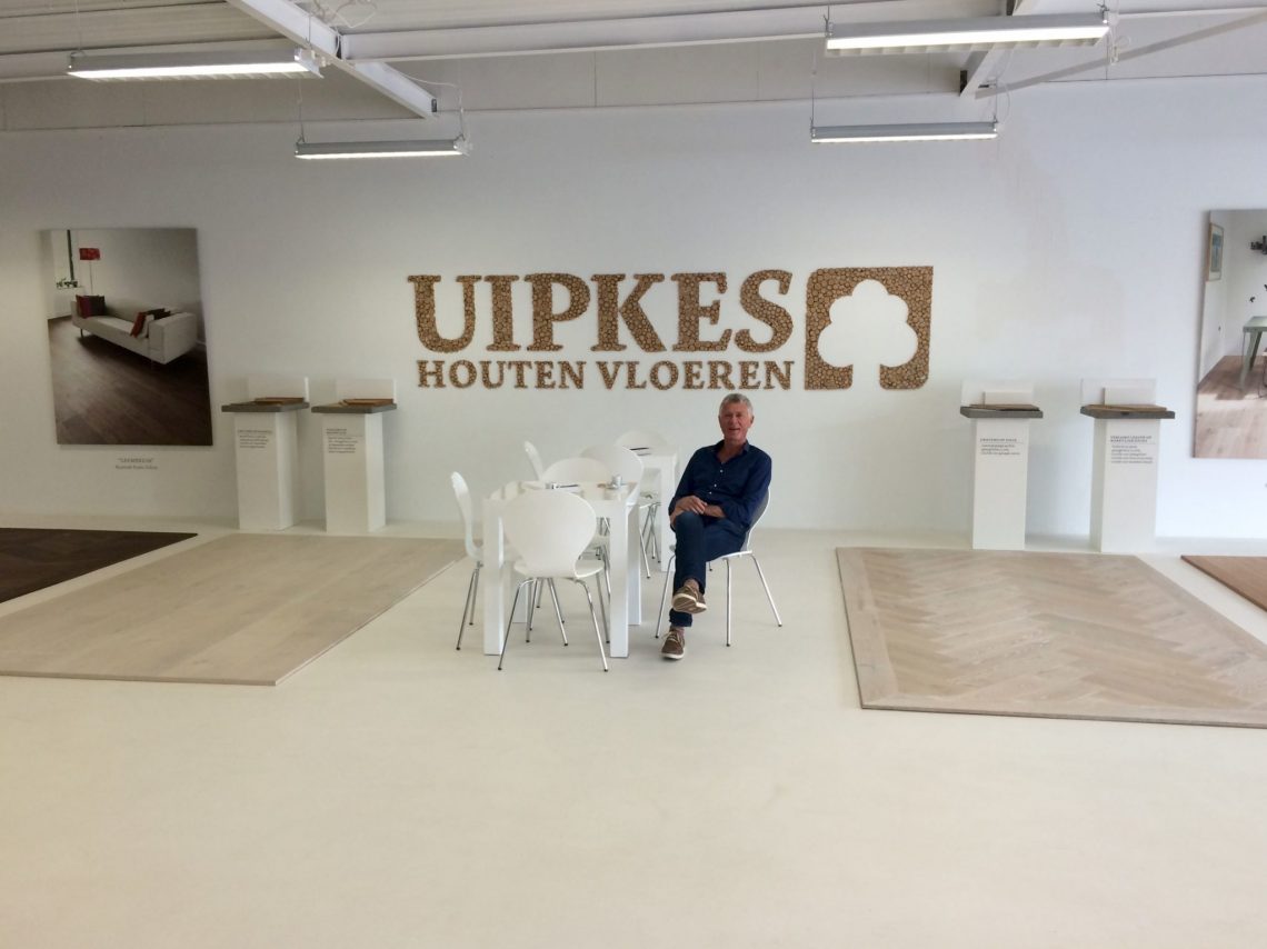 Eenmaal binnen bij Uipkes was het meteen heel blij! Een mooie showroom met een meneer die alles weet en echt van zijn vloeren houdt. En ook van klanten. Er bleek weldegelijk vloerverwarming te kunnen onder een houten vloer; eea hangt af van de lijm en andere factoren die Uipkes onder controle heeft en er zijn allerlei kleuren mogelijk.
