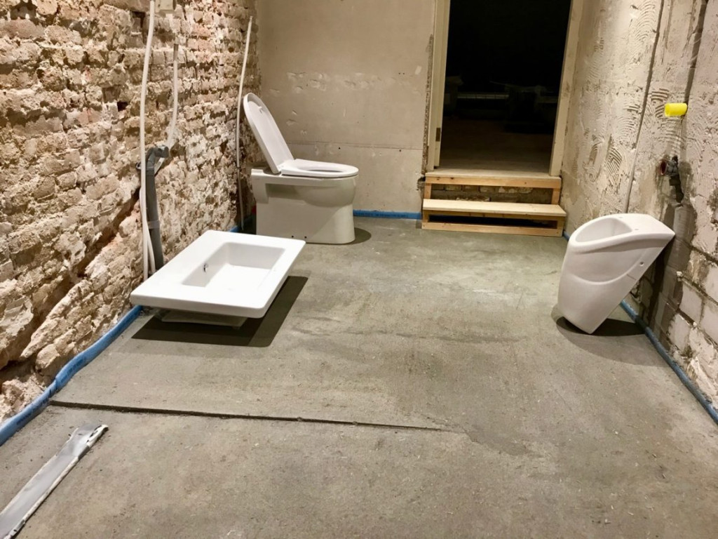 Het afgelopen weekeind heeft onze badkamervloer rustig kunnen drogen, vandaag stond ik er voor het eerst bovenop. Het gaat leuk worden in dat hokje. Ik heb een tijdelijk trappetje getimmerd, zodat we zondag veilig een rondleiding kunnen geven.