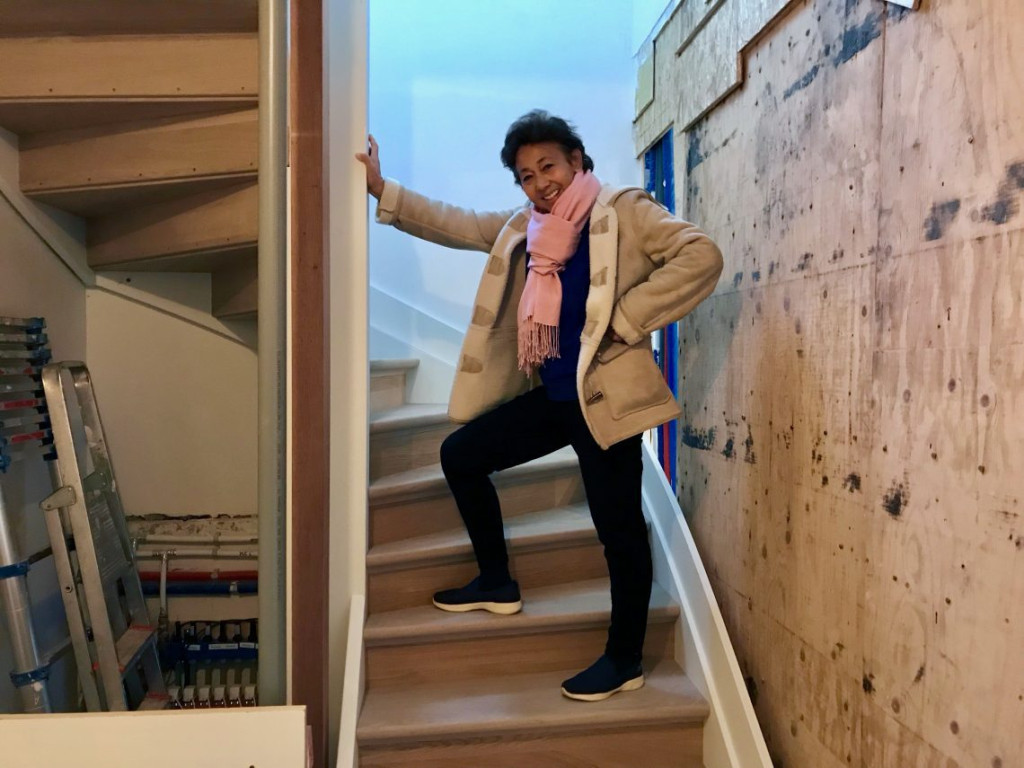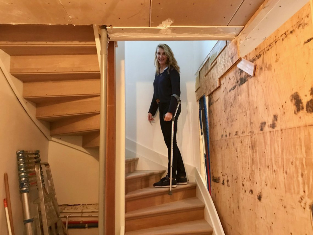 Meteen een goede gelegenheid om onze trap op invalide-geschiktheid te testen. Kan Monique makkelijk naar boven?