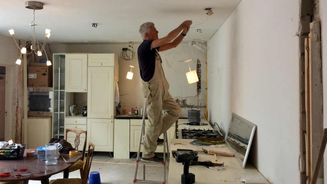 Terwijl ik het koper aan het vermoorden was in de ‘woonkamer’ ging Hessel verder met de electra in o.a. de keuken. Op basis van zijn lichtontwerp worden met een laser op alle juiste locaties electrapuntjes gemaakt.