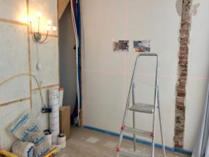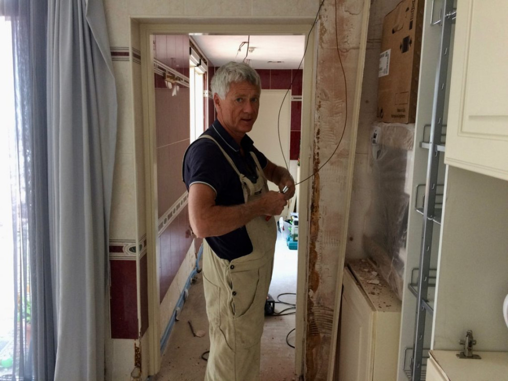 Nu hoor ik u denken: “Issie nou nog steeds met die electra bezig?” Ja dat issie weldegelijk, want het is een zeer nauwkeurig en intelligent werkje, de bestaande leidingen zijn talrijk en de keuken is huge evenals het aantal lichtpuntjes en electragroepen voor de apparatuur. Plus dat we nog in afwachting waren van de berekeningen van de balken in het keukenplafond en de stalen constructie boven de tuindeuren, plus dat etc etc.