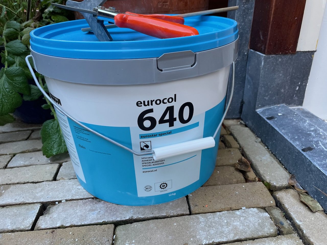 Wonderlijke lijm trouwens, Die Eurocol 640. Je mag de PVC er op leggen als de lijm nog nat is, maar het mag gerust ook uren later. De PVC blijft meteen keurig vast liggen.