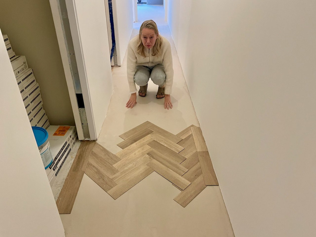 Annie en ik hadden al voorwerk gedaan. “Als we het patroon nou zo leggen, dan komt het goed uit in zowel de woonkamer als de gang en de slaapkamers.”