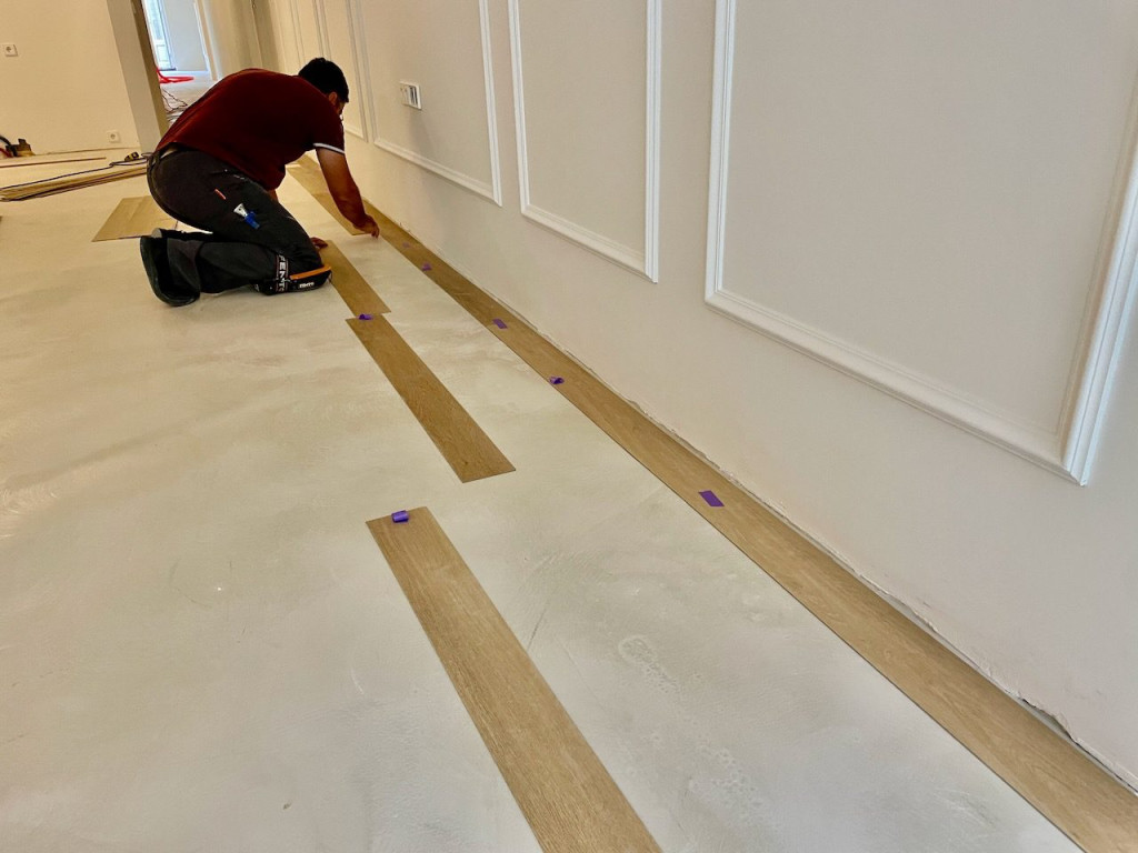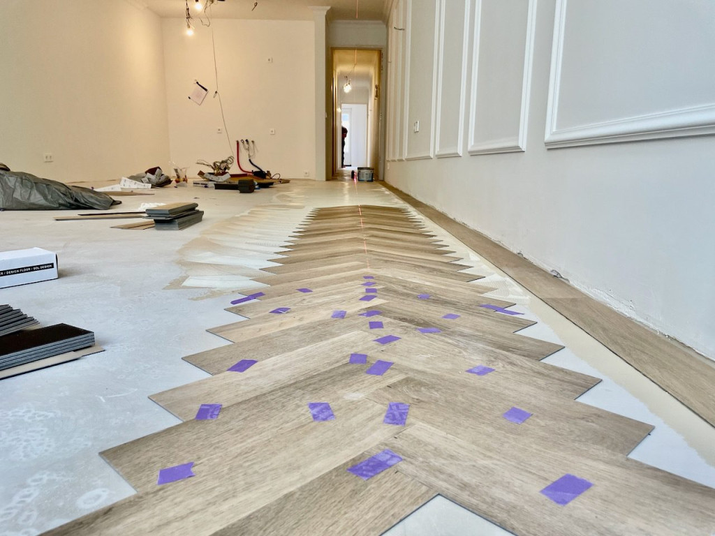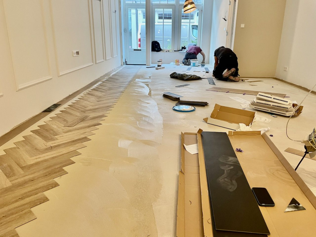 Ik herinnerde me dat nog van het parket in ons eigen huis. De voorbereidingen duren het langst. Als de eerste rij eenmaal vast zit, dan hoef je de rest alleen nog maar netjes in de lijm te leggen.