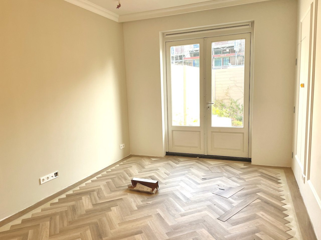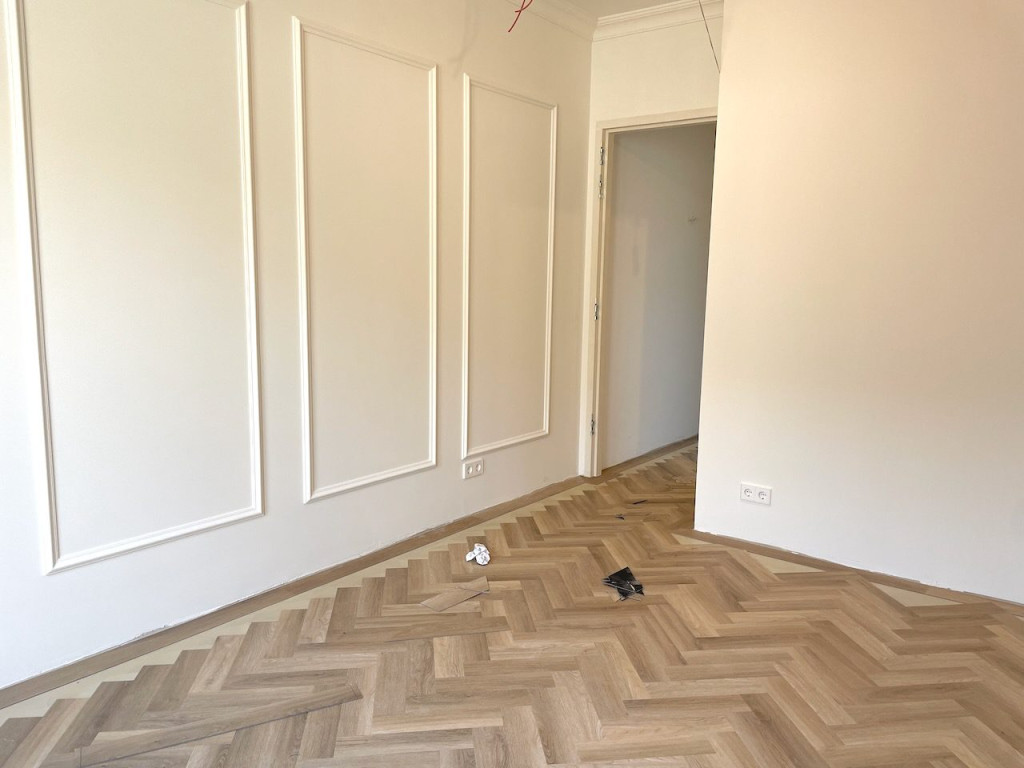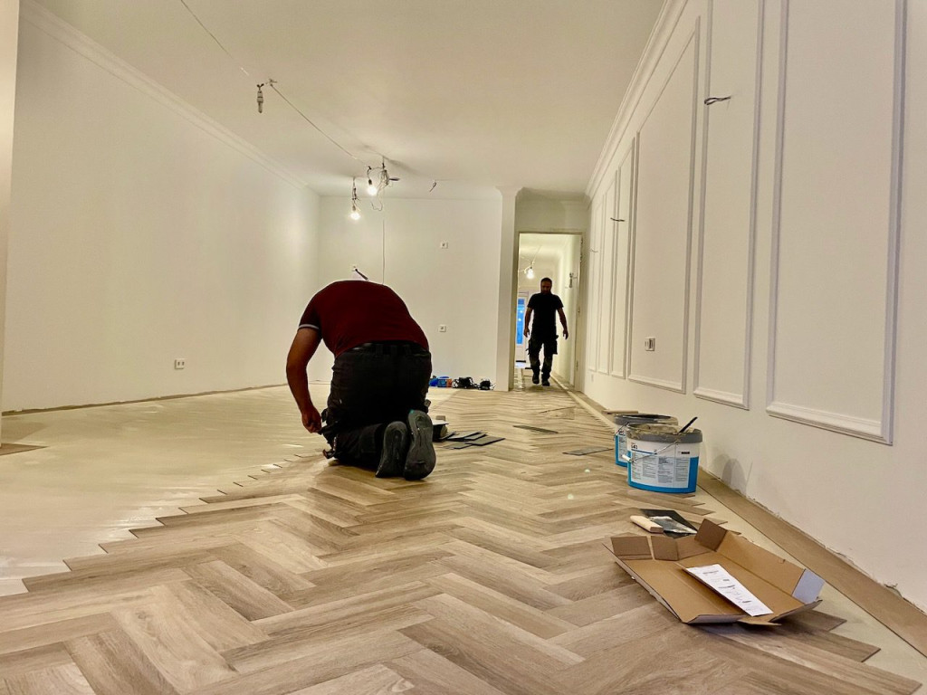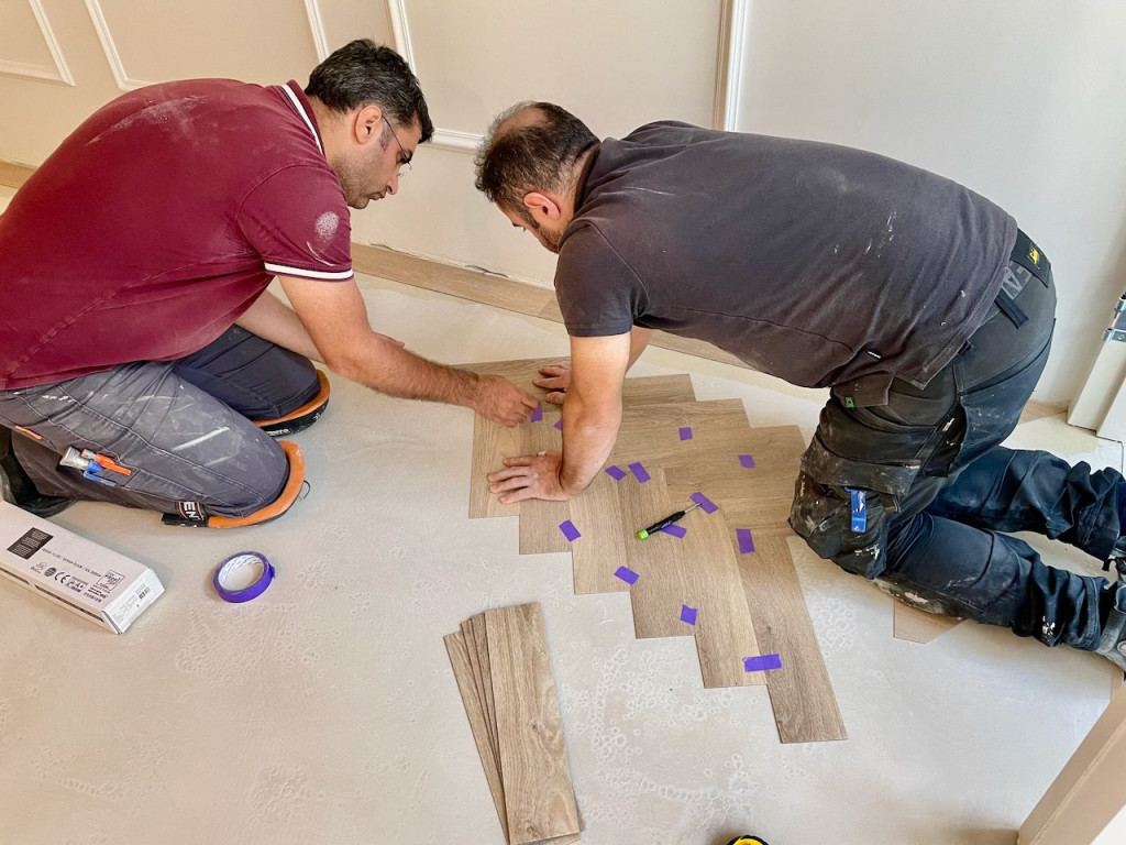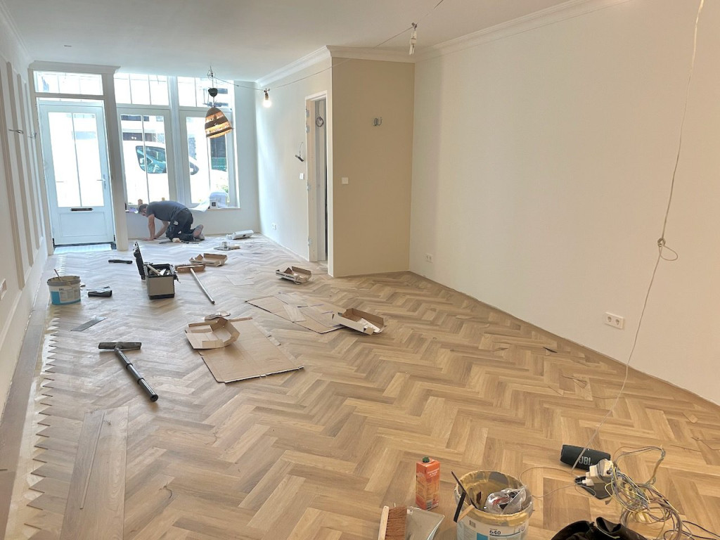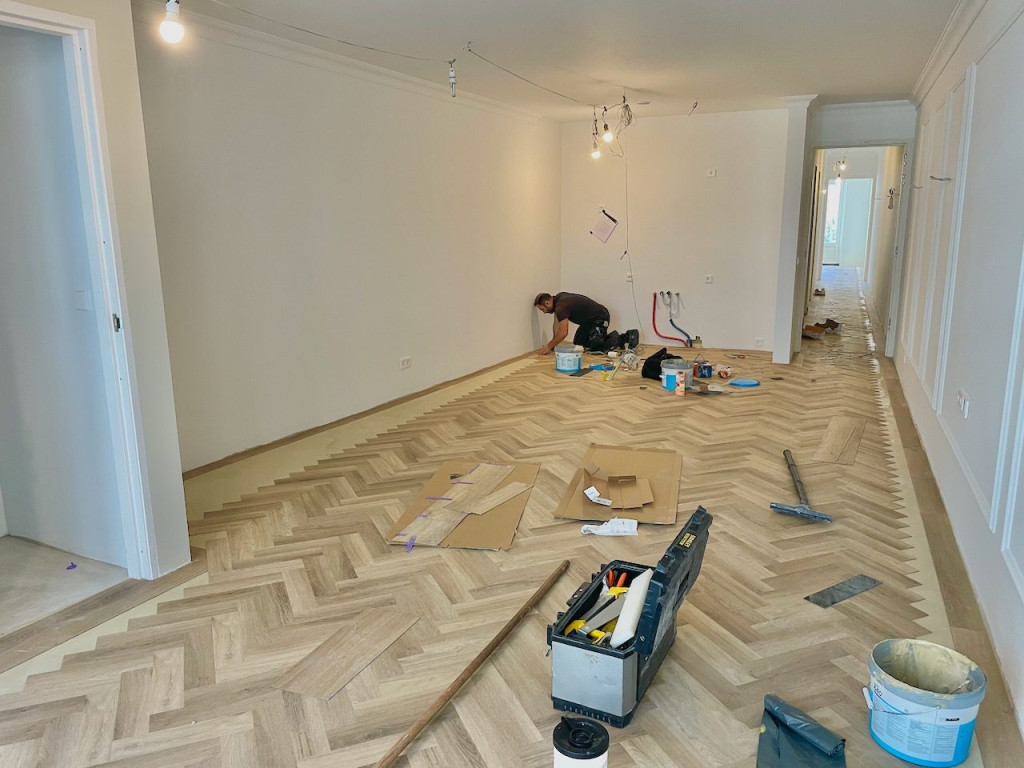 De mannen van Leeuwenkamp zijn gisteren voortvarend van start gegaan. Gisteren was banden-dag. Om de een of andere reden geeft het een verzorgd gevoel als een visgraatparket niet tot de plint doorloopt, maar rondom een “band” heeft. Dus wij wilden een band. In de collectie van Ambiant zit ook de Avanto plank. Lange planken, 22cm breed. Met dezelfde print als onze Spigato.