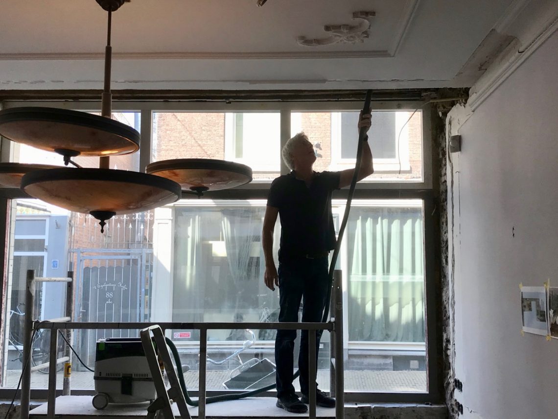 Thuisgekomen starte Hessel in de woonkamer. We deden een topdown benadering: eerst de plafonds en de muren stofzuigeren en afborstelen…