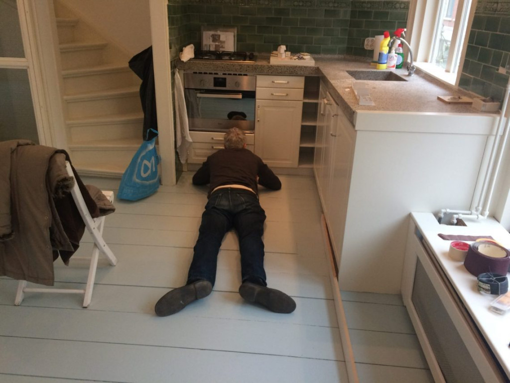 Een heel kort afscheidsblogje nog. Vanmorgen moest Hessel eerst naar de oogdokter, maar gelukkig is er niets ergs. Daarna naar Haarlem. De details moesten nog afgewerkt worden. Enkele stukjes hout werden geverfd. De plinten onder de keuken geverfd en gemonteerd….