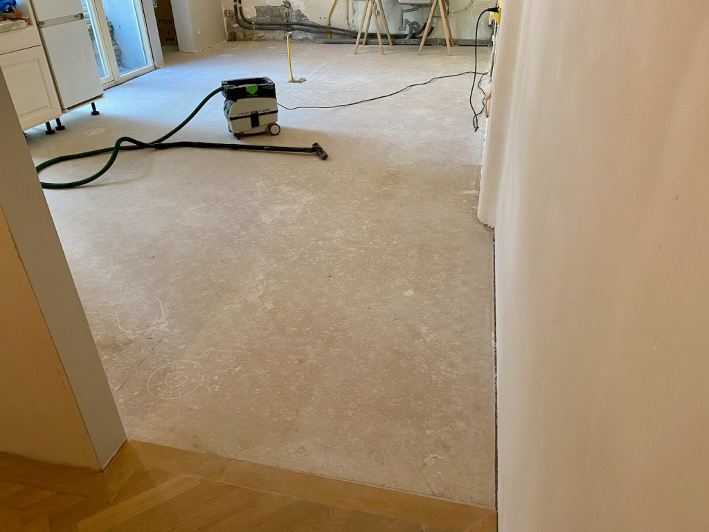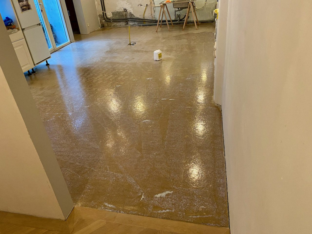 Daarna ging hij twee keer in de primer. Weber Tile Prim. Speciaal ontwikkeld voor anhydriet vloeren.